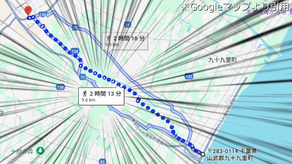 「Googleマップを見た感じ、なんか歩いていけそうな距離だったから」という、ただそれだけの理由です。